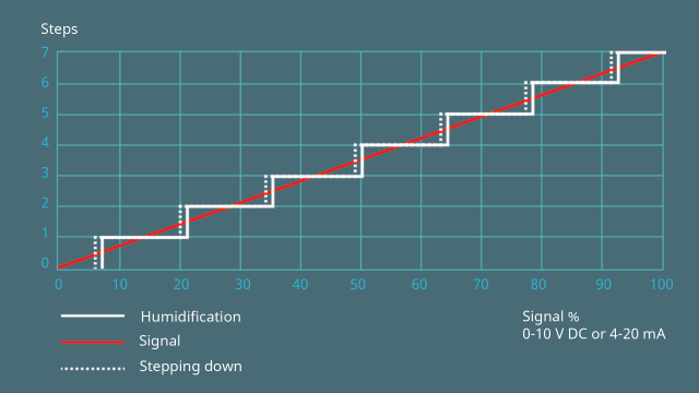 We have designed a modulating control that always supplies an adaptable water flow to avoid unnecessary waste and variation in the humidity.