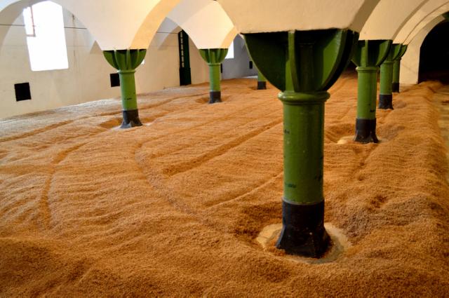 Malting, i.e. the germination of barley which produces sugars, takes place on malting floors where the barley is watered and left to sprout. Dry spots must be avoided in order for the barley kernels to germinate properly and evenly and to avoid product loss.
